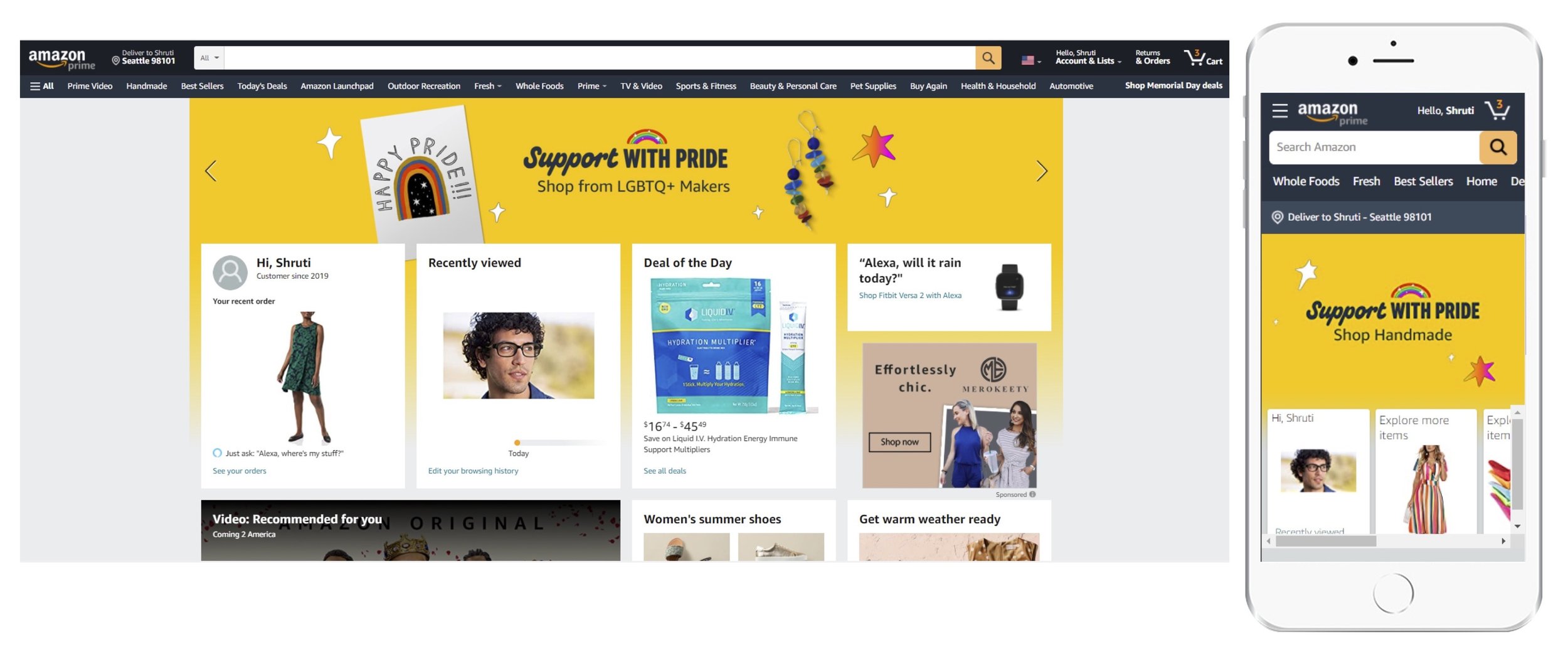 We created a red thread throughout all categories of Amazon. Teams could simply add "with Pride" to their messaging to show their support with Pride. We also partnered with award-winning illustrator, Leandro Lebassis, to create illustrations and typography for placements on Amazon.com.